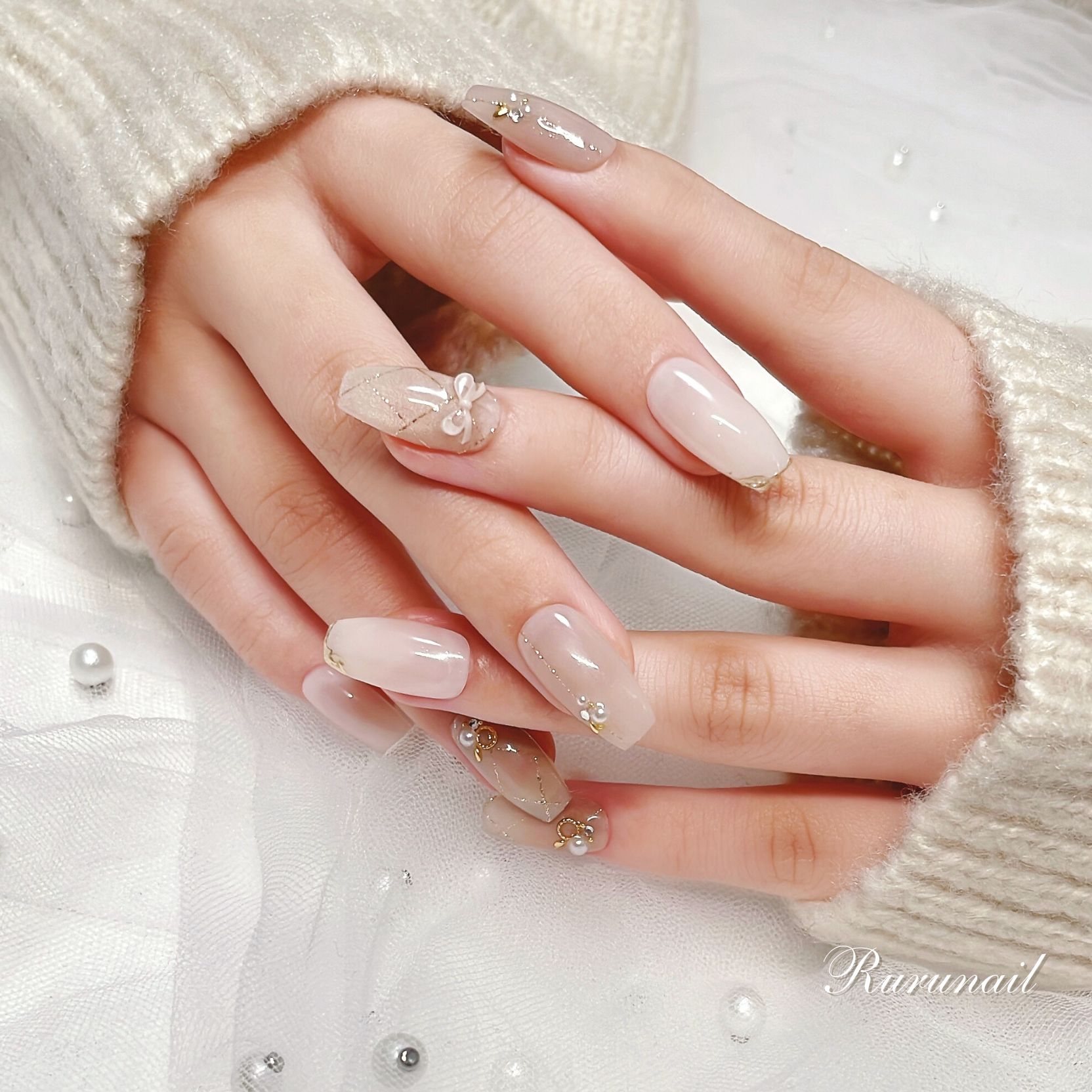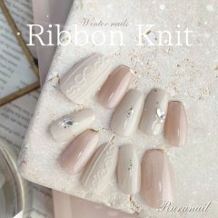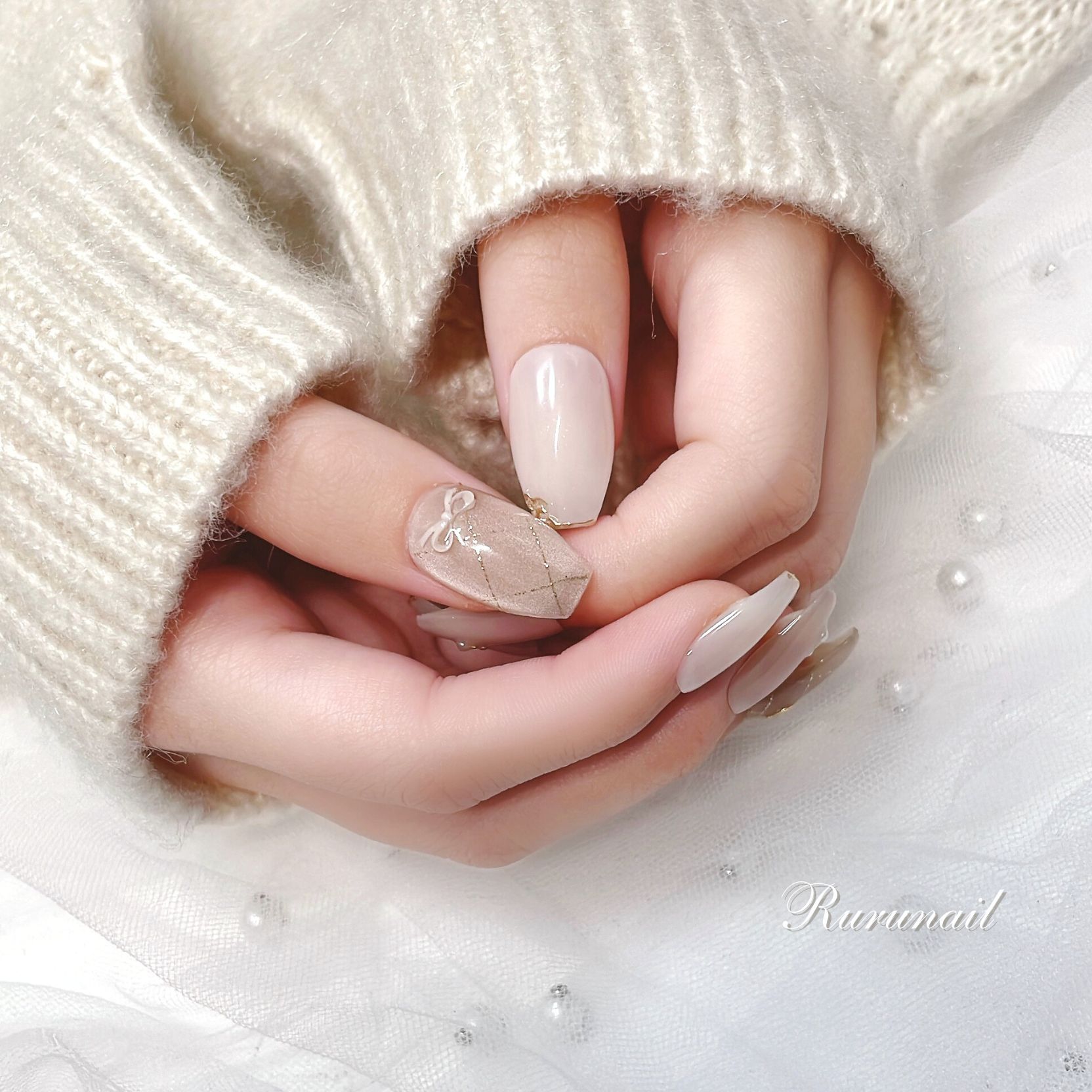 落ち着いた甘めドットとリボンのネイルチップ(076)
