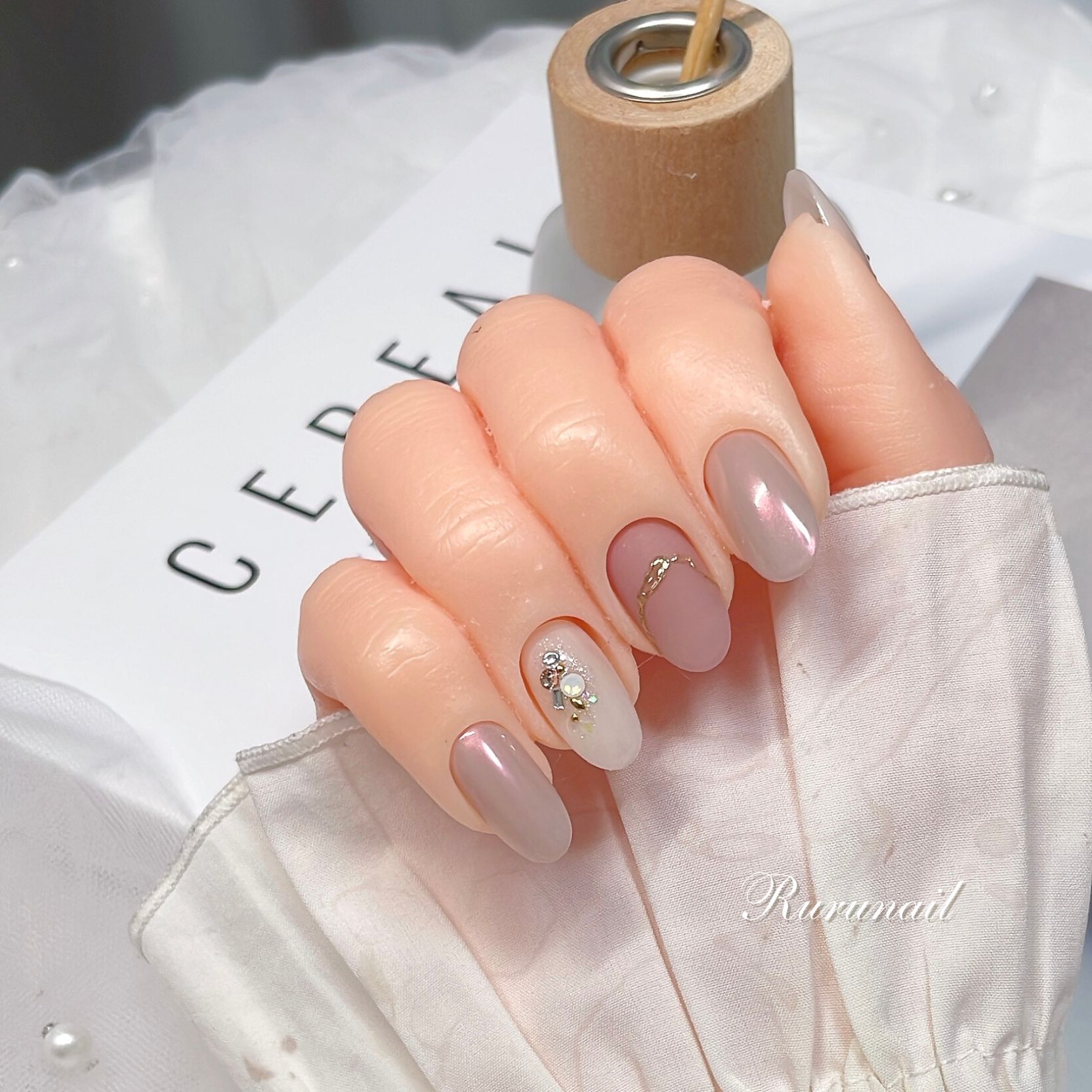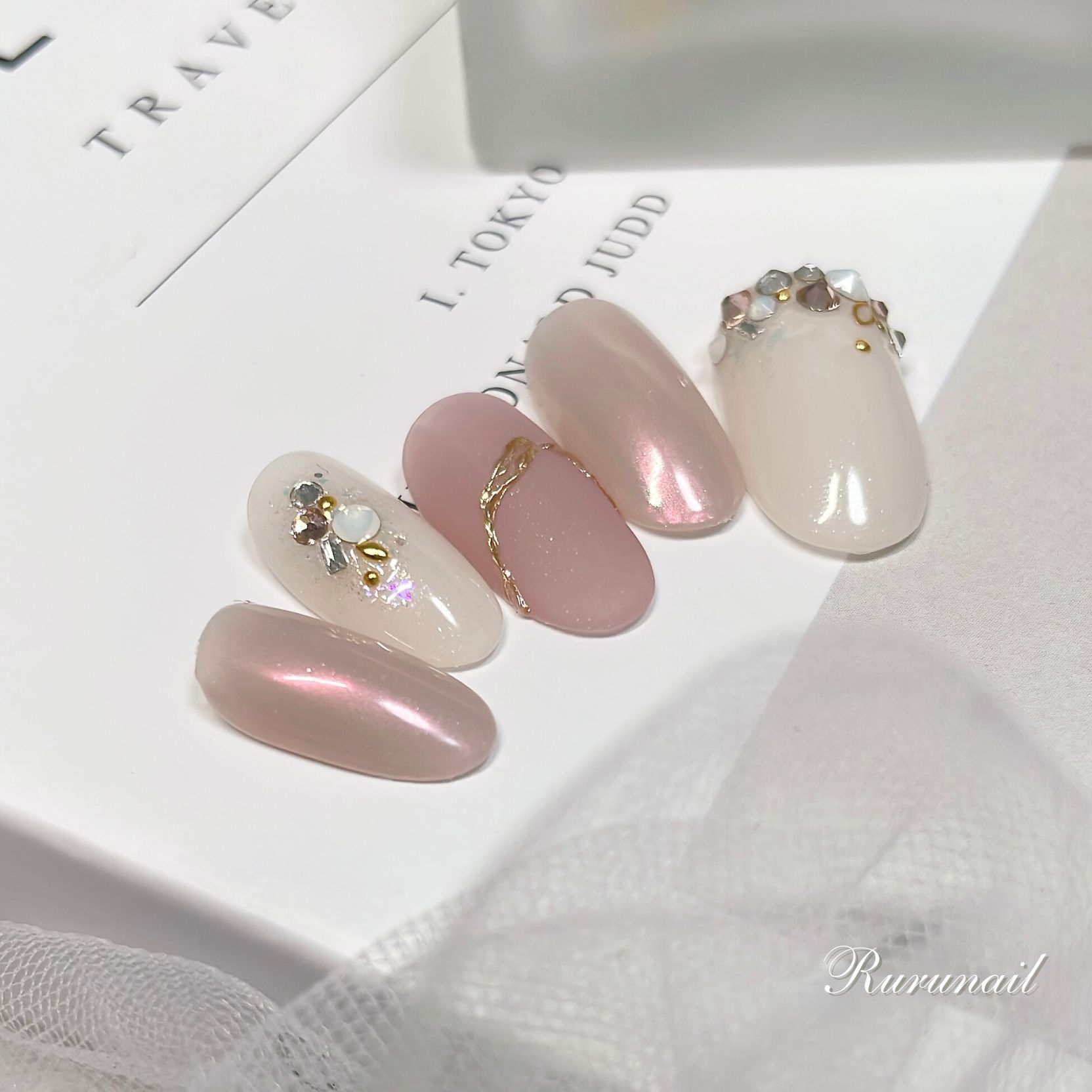 ピンク系大人デザイン。人差し指と小指のピンクオーロラはお外で品よく輝きます。中指はマットにしゴールドミラーをアクセサリー風でポイントに。ストーンアートもキラキラ華やかさをプラス。普段使いからお呼ばれなど指先をキレイに見せたい時に
